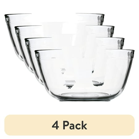 Our glass mixing bowl is the ultimate mixing multitasker. Mix, pour, cover, and store. Glass is extra-thick with wide openings and thick rims for maximum durability. At 4-quarts, this mixing bowl is perfect to dress salads, marinate chicken breasts, whip sauces, marinate meats and fishes, whip cream, microwave soups, and more. Each clear glass mixing bowl is microwave, fridge, freezer, and dishwasher safe.