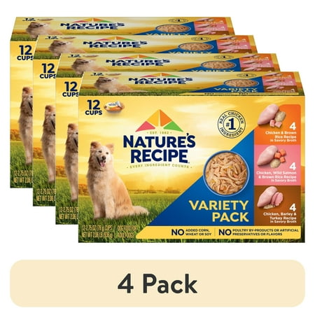 Make every meal a wag-worthy experience with Nature’s Recipe dog food recipes. This wet dog food variety pack includes three delicious recipes made with real chicken as the number one ingredient: Chicken & Brown Rice Recipe in Savory Broth, Chicken, Wild Salmon & Brown Rice Recipe in Savory Broth and Chicken, Barley & Turkey Recipe in Savory Broth. These natural dog food recipes are made with added vitamins, minerals and nutrients to help support all your dog’s needs. And because we believe that every ingredient counts, you’ll find no added corn, wheat or soy, no poultry by-product, and no artificial flavors or preservatives in any of these purposefully crafted recipes. So, peel back the lid and fuel the wag with tasty meals that provide all your dog needs, and nothing they don’t.